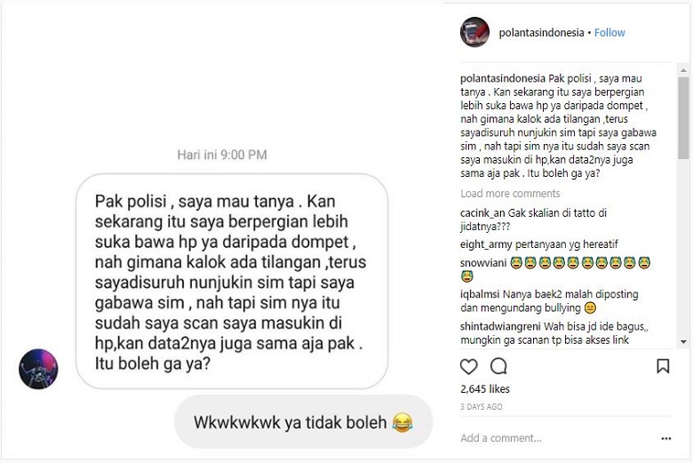 "Pak polisi, saya mau tanya. kan sekarang itu saya berpergian lebih suka bawa hp daripada dompet, nah gimana kalok ada tilangan, terus saya disuruh nunjukin SIM tapi saya ga bawa SIM, nah tapi SIM-nya itu sudah saya scan saya masukin di hp, kan data-datanya juga sama aja pak. Itu boleh ga ya?" tulis salah seorang netizen pengguna instagram.